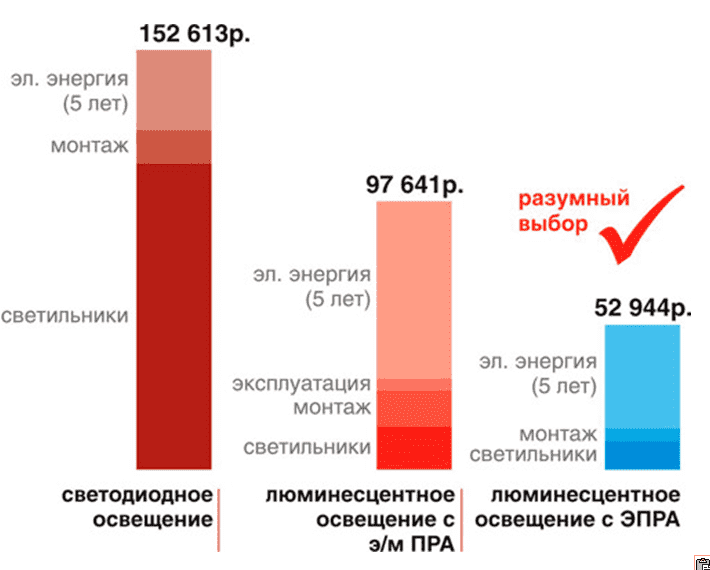 Трудно, а зачастую и бесполезно разговаривать с человеком, который свои «экономические» обоснования при выборе источника света определяет ценой того или иного конкретного светильника без учёта его технических характеристик. Для обеспечения определённой освещённости мы должны создать определённый световой поток, определив его конкретную начальную цену, а также затраты на его поддержание в процессе эксплуатации. Рассмотрим экономические показатели трёх вариантов источников света (люминесцентные светильники с электромагнитными ПРА, с электронными (ЭПРА) и светодиодные) на примере освещения спортивных и промышленных помещений.