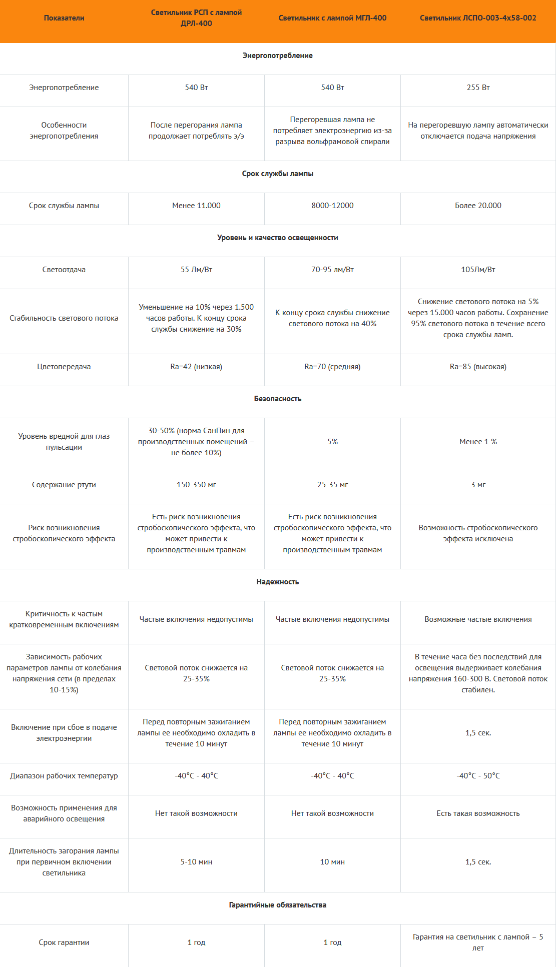 Сравнение светильников для производственных, спортивных и иных помещений с высотой подвеса свыше 6 м.